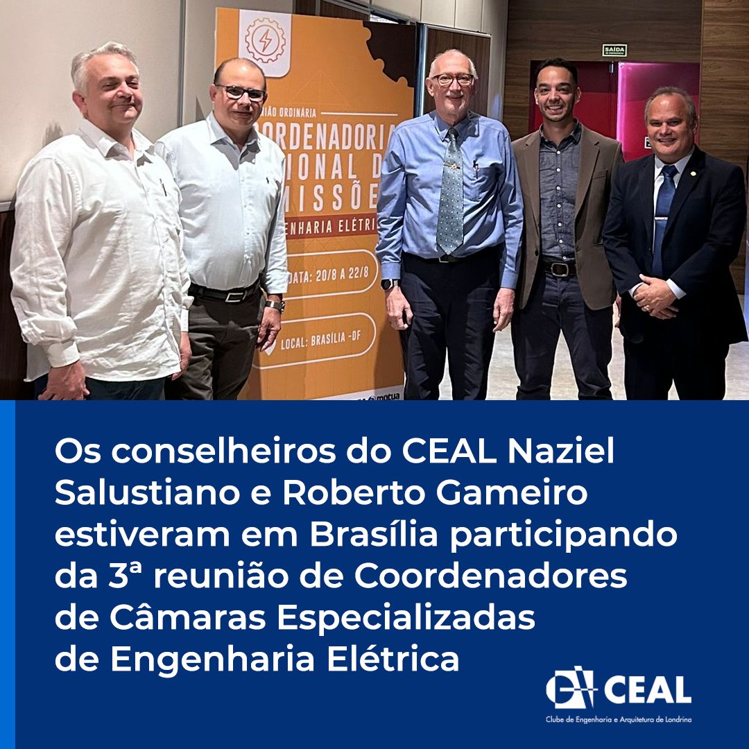 Os engenheiros Naziel Salustiano, gestor de fiscalização do Crea-PR, Roberto Gameiro, coordenador da Câmara de Engenharia Elétrica do Crea-PR, ambos conselheiros do CEAL, juntamente com o engenheiro Leonardo Marçal, assessor técnico da CEEE-Crea-PR, estiveram recentemente participando da 3ª Reunião de Coordenadoria de Câmaras Especializadas de Engenharia elétrica – CCEEE.